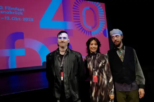 Der Moderator Jonas Hilmerichs und die Darsteller*innen Violetta Rahachova & Alexey Lyubchenko von „The Swan Song of Fedor Ozerov“. Foto: Kerstin Hehmann